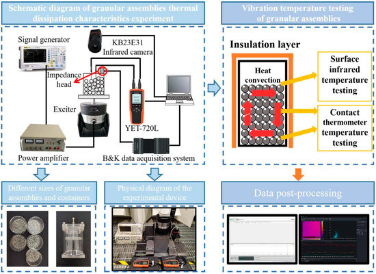 During forced vibration, particles show a wide range of motion states and complex kinetic properties. However, energy conversion, consumption, and transfer during particle aggregate vibration have yet to be unified [5]. The various engineering applications of particle aggregates have promoted research on their energy dissipation mechanisms. Meyer studied the energy loss of particles under forced vibration conditions and established design principles for particle applications [6,7,8]. Mao analyzed the collision and friction between particles using the discrete element method and discussed the energy consumption forms of particles [9,10]. Using the discrete element method, Yin explored the dissipation capabilities of particles with various motion states [11]. Zhang conducted experimental studies on the energy loss process of particle aggregates during forced vibration and obtained changes in the kinetic and potential energy of particles during vibration [12,13]. The research on the energy dissipation of particle aggregates focuses on the changes in kinetic energy and potential energy caused by particle collision and friction. The recovery coefficient is an essential basis for establishing different dissipation models. Models are established based on the change in recovery coefficient caused by collisions between particles. These models make it difficult to describe the relationship between particle collisions and thermal energy consumption.