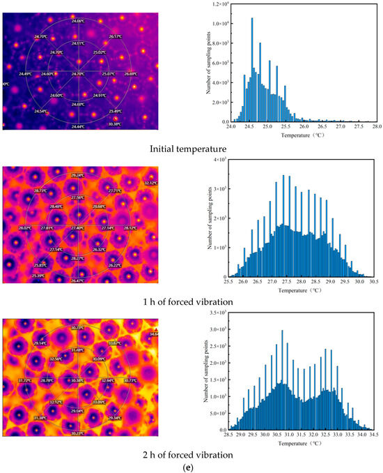 In this study, the temperature changes in 2 mm granular assemblies under five typical vibration conditions, namely, the solid-like state, micro-vibrational state, intermediate vibrational state, strong vibrational state, and gas-like state, are tested. The classification of the forced vibration state of the particles is shown in Appendix B. After being subjected to forced vibration, the particles consume energy through collisions and friction. It is generally believed that a large amount of energy dissipates as heat energy, but there is little research on this process. The changes in the surface temperature of the particles under the five typical vibration conditions over a period of 2 h are shown in Figure 5. The figure is the enlarged figure of the local surface temperature distribution of the particles taken by the infrared thermometer and the histogram of the temperature distribution of the particles in the image. The temperature distribution of the local surface of the particle is enlarged, and the color tends to be bright yellow at the higher temperature. The local surface temperature distribution amplification diagram of the particle is used to reflect the temperature distribution characteristics of the local temperature distribution amplification diagram of the particle.