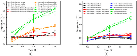 The temperature change curve of particles in different motion states at the same frequency is shown in Figure 6. The change in the temperature curve shows that for particles in different motion states, the corresponding temperatures of the upper, middle, and lower layers change. Under continuous excitation, the temperature changes in particles with the same vibration state are similar. Particles in the strong vibrational state and gas-like state have obvious temperature-increasing effects, while those in the solid-like and intermediate vibrational states do not show obvious temperature-increasing effects, and particles in the middle vibrational state have a specific temperature-increasing effect.