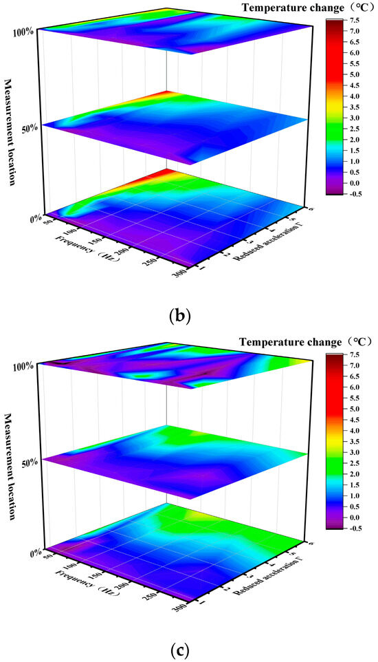 The temperature change in the 2 mm granular assemblies for different frequencies and reduced accelerations is analyzed. The excitation frequency interval is 50 Hz, with reduced accelerations of 0.8, 1.2, 2.5, and 6. The granular assembly container’s surface, middle layer, and bottom layer temperatures are also measured for approximately 1 min. As shown in Figure 7, there is a general heat loss phenomenon in the particle aggregate, and there are differences in the heat loss effects of the internal particles. The temperature changes show that the heating effect of the granular assemblies is evident at low frequencies and large, reduced accelerations. With increasing frequency, the heating effect of the granular assemblies gradually weakens. This is because as the frequency increases, the vibration states of the particles in the aggregate mainly transition from the micro-vibration and intermediate vibrational states, and the collision and friction between particles are not obvious. Interparticle interactions are the key to generating heat loss, so the heating effect of the granular assemblies decreases. When the reduced acceleration increases and the corresponding amplitude increases, the vibration states of the particles gradually transition from the solid-like, micro-vibrational, and intermediate vibrational states to strong vibrational and gas-like states. The interaction between particles becomes more intense, and the heating effect of the granular assemblies becomes evident. The temperature distribution of the internal particles shows a gradually weakening trend from the bottom to the surface. During the first hour of forced vibration, the particles in the strong vibration and gas-like states experience significant temperature increases, while those in the micro-vibrational and intermediate vibrational states experience slow temperature growth. When the vibration time continues to increase to 2 h, the temperature increase in the particles in the strong vibrational and gas-like states decreases, while the particles in the micro-vibrational and intermediate vibrational states continue to experience a significant temperature increase. This reflects a limit to the forced vibration heating effect of the granular assemblies, that is, at this point, the input energy and the temperature dissipated to the environment are in a dynamic equilibrium state.