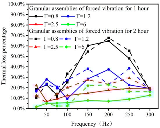 Figure 8 shows the change in the thermal loss percentage of a forced-vibration particle as a function of frequency and reduced acceleration under vibration for 1 h and 2 h. As the frequency increases, the thermal loss of the particle increases. Similarly, as the reduced acceleration increases, the thermal loss of the particle decreases. In this vibration state, although particles in strong vibrational states and gas-like states are intensely vibrating and have significant heating effects, the input energy to the particle is large and is mainly converted into the internal kinetic energy and potential energy of the particle. Later, frictional collisions between particles further generate thermal losses, but they are chiefly stored in the form of kinetic energy and potential energy to maintain the vibration state of the internal particle. Therefore, the thermal loss percentage is relatively small. When particles are in solid-like, micro-vibrational, and intermediate vibrational states, there is tight interaction between particles. The input energy is generally converted into the potential energy of the particle and kinetic energy resulting from micro-vibration and micro-rotation, resulting in thermal losses. At this time, the input energy is small, and the motion of the particle is not intense, so the thermal loss percentage is high. The thermal loss percentage does not exceed 70% during the energy consumption process of particle vibration. A large amount of energy may be stored in the form of the internal kinetic energy and potential energy of the particle or dissipated efficiently.