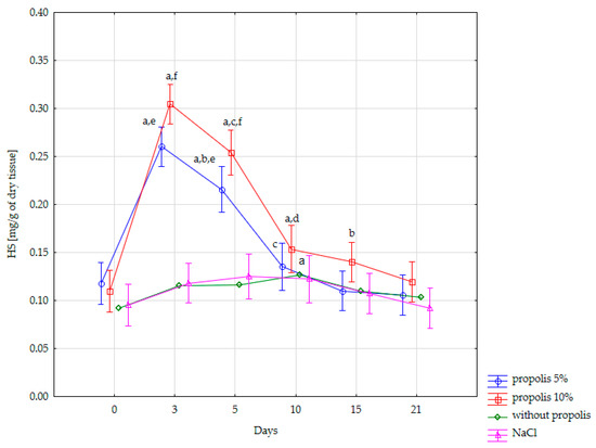 Based on the obtained results, it was found that the content of HS in the wound bed differed significantly during the healing of the wound treated with a nonwoven dressing containing both 5% and 10% propolis between the 3rd and 5th and the 5th and 10th day of therapy (p < 0.001).