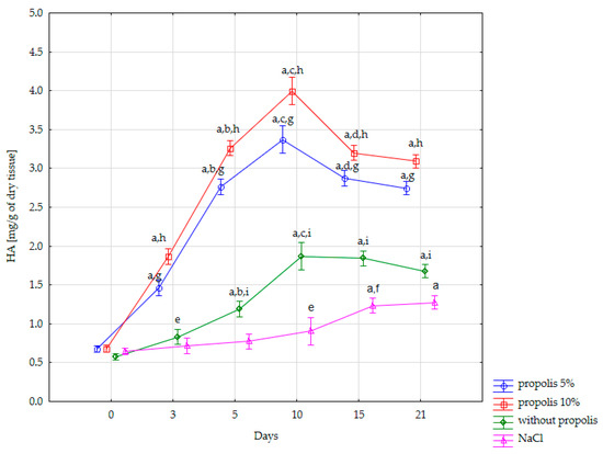 Dynamics of changes in the content of HA in a burn wound during subsequent days of its treatment with a nonwoven dressing containing 5% propolis: a—statistically significant difference compared to day 0 after the burn (p < 0.001), b—statistically significant difference in relation to the 3rd day after the burn (p < 0.001), c—statistically significant difference in relation to the 5th day after the burn (p < 0.001), d—statistically significant difference in relation to the 10th day after the burn (p < 0.001), e—statistically significant difference compared to day 0 after the burn (p < 0.05), f—statistically significant difference in relation to the 10th day after the burn (p < 0.01). Differences in the content of HA in post-burn wounds in the following days after the exposure to the thermal factor, depending on the wound dressing method used: g—statistically significant difference in the HA content in the wound treated with a nonwoven dressing containing 5% propolis, compared to the wound treated with NaCl solution, on the same day of the experiment (p < 0.001), h—statistically significant difference in the HA content in the wound treated with a nonwoven dressing containing 10% propolis, compared to the wound treated with NaCl solution, on the same day of the experiment (p < 0.001), i—statistically significant difference in the HA content in the wound treated with a nonwoven dressing without propolis compared to the wound treated with NaCl solution, on the same day of the experiment (p < 0.001).