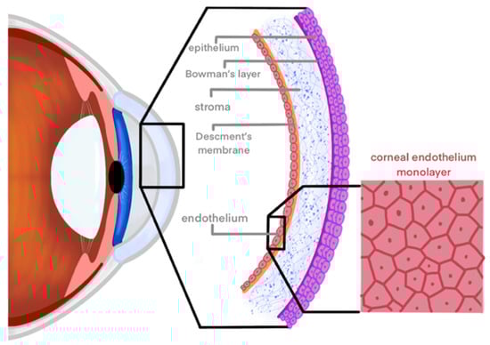 The cornea, a transparent avascular tissue of the anterior eye, transmits incoming light while also providing the necessary anterior refractive surface, contributing to approximately two-thirds of the eye’s total refractive power [1]. The cornea is traditionally anatomically segmented into five layers, progressing from the outermost epithelium, Bowman’s layer, the stroma, Descemet’s membrane, to the innermost endothelium; however, it is important to acknowledge that the cornea’s anatomy is, in reality, more nuanced (Figure 1) [2,3]. The corneal endothelium, a single layer of cells lining the posterior corneal surface, regulates water flow, maintains tissue hydration at approximately 70%, and sustains clear vision by coordinating ionic pumps and tight junction barriers [4]. Among the key components of these tight junctions is ZO-1, a submembranous protein located along the apical side of the cells that contributes to structural integrity by forming hexagonal shapes and aiding in signal transduction [5,6,7].