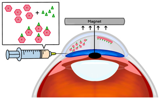 Magnetic nanoparticle-guided delivery of corneal endothelial cells for ocular regeneration. Depiction of the general method for targeted delivery of corneal endothelial cells using magnetic nanoparticles. Corneal endothelial cells are combined with magnetic nanoparticles and injected into the anterior chamber of the eye. An external magnet is utilised to localise the cell–nanoparticle complex precisely to the central area of damaged endothelial cells. This approach aims to enhance the efficiency and efficacy of cell therapy for corneal regeneration, offering precise targeting for the treatment of corneal dysfunction.
