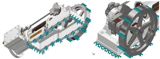 Boundary conditions were imposed by constraining the six degrees of freedom of the lower surface of the bedplate and the flywheel (Figure 5). Concerning the lower surface of the bedplate (Figure 5, left), all displacements and rotations were constrained to simulate the connection of the base to another solid. For the flywheel (Figure 5, right), the external surface was restricted to simulate critical positions, such as the locking of the flywheel during the initiation of machine operation. The flywheel was immobilized (all degrees of freedom were restricted) as it is the sole means to transmit torque to the engine. To summarize, in both cases, displacements in all directions and rotations around the axis of the local reference system of each solid were restricted.