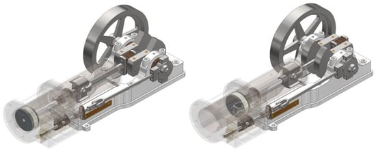 This current investigation followed this research trajectory, analyzing one of the inventions of this English engineer: a single-cylinder horizontal steam engine with a crosshead trunk guide. Recent research on this invention [] has facilitated the acquisition of its 3D CAD model from the drawings published in 1957 in the magazine Model Engineer [], as reproduced by Julius de Waal []. This has provided a deeper understanding of its design and allowed for a detailed explanation of its operation, as there is no available information regarding its operational characteristics.