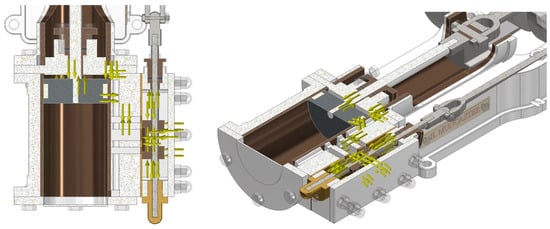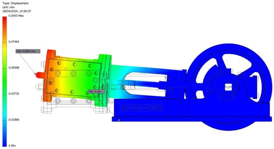 Regarding displacements, a scale factor of 2 was employed to more clearly visualize the deformed configuration of the steam engine at both critical positions (lower and upper dead center). It is logical that the maximum displacements occur at the observed location, as that portion of the steam engine functions as a cantilever. This observation suggests that potential optimization could involve enhancing the bedplate design by extending it to the valve chest area and securing it with cap screws. Nonetheless, the observed displacements are negligible, which supports the efficient operation of the steam engine under the given pressure load. This validates the hypothesis of small deformations, allowing for calculations to be performed in the undeformed state using the Eulerian formulation method for discretization, thereby reducing computational costs. Furthermore, the absence of significant deformations ensures minimal friction due to the relative movement between components.