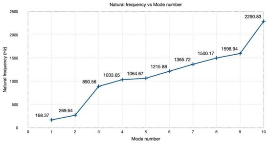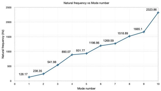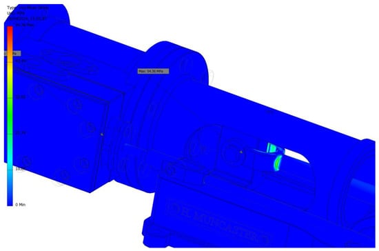 Figure 21 presents a graph depicting the modal analysis conducted for this critical position, analogous to the previously examined critical position. Notably, it was observed that none of the natural frequencies were zero, thereby justifying the application of linear static analysis. This indicates that under the simulation conditions at the critical position corresponding to the piston at the upper dead center, the system did not exhibit the behavior characteristic of a mechanism.