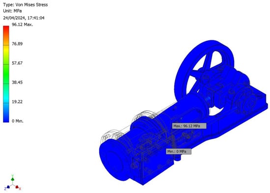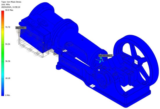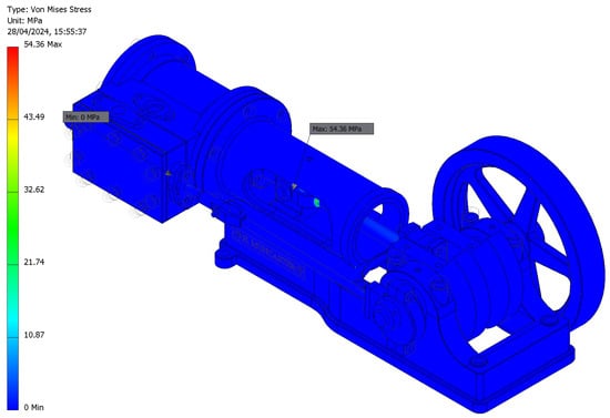 Conversely, given that the comprehensive operation of the invention has been documented [], only a concise description will be provided to enhance the conceptualization of the analysis conducted and the working hypotheses from a design perspective. Each of the preceding stages were outlined before executing the linear static analysis. In this analysis, the von Mises stresses and the displacements experienced by the machine components were scrutinized, as these variables mechanistically characterize the behavior of the machine in its entirety, ensuring that its operation under real operating conditions is entirely secure.