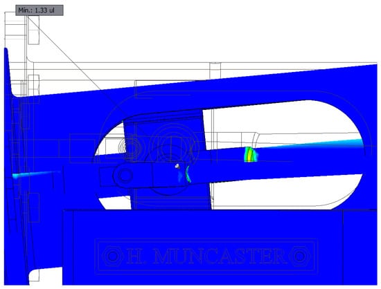 In addition, the distribution of displacements was obtained (Figure 25) and is shown with an increased scale factor (×2) for better observation. As can be seen, the value was negligible but it was considered since it was the only part of the engine that was cantilevered.