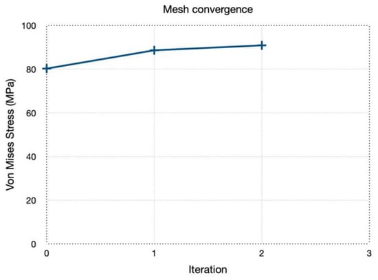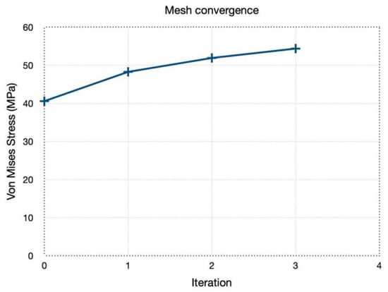 Similar to the analysis at the lower dead center, the working pressure was set at 0.32 MPa. It was imperative to verify whether all the values conformed to the required criteria, with particular attention to ensuring the safety factor exceeded unity. Upon conducting the analysis with various mesh sizes, a mesh convergence analysis graph was generated (Figure 22). Additionally, data regarding element size, von Mises stress, relative error (%), and iteration number were compiled (Table 3).