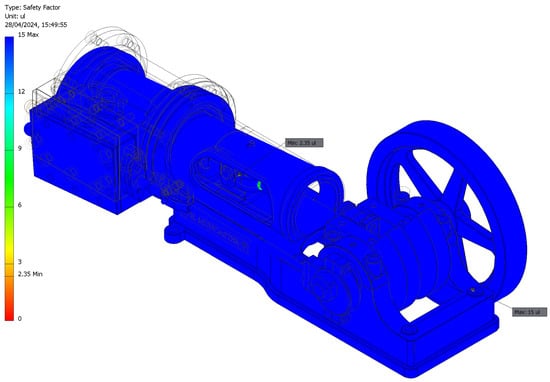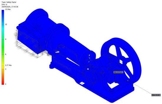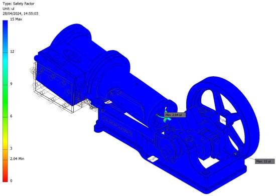 Finally, Figure 26 illustrates the distribution of the safety factor, and in Figure 27, the position of the lowest value (2.04) is shown, located in the connecting rod.