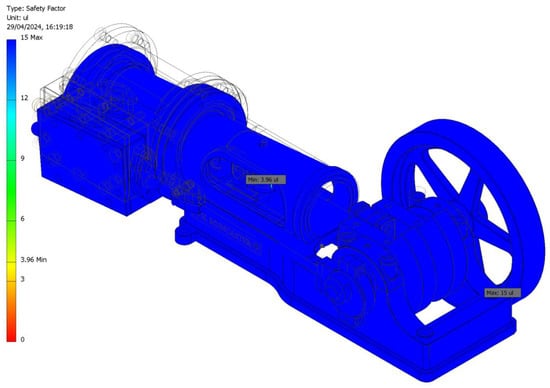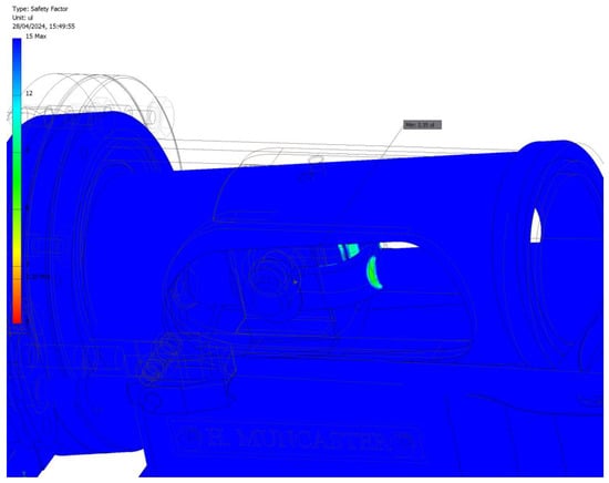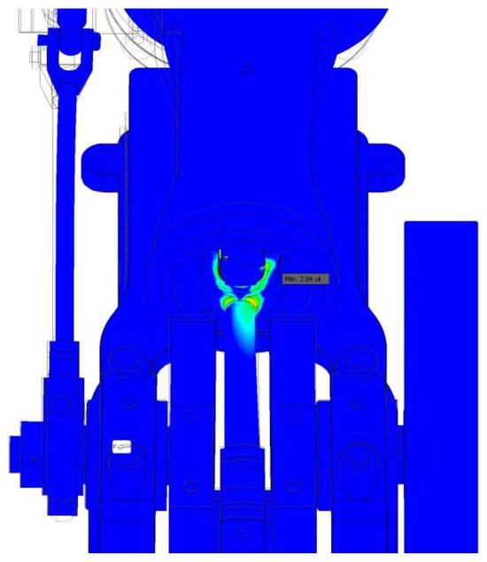 As a check, this pressure was also applied to the upper dead center, verifying that the safety factor is below 4 (3.77), as mentioned previously (Figure 29).
