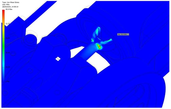 Furthermore, Figure 16 illustrates the distribution of von Mises stresses, while Figure 17 pinpoints the location of the maximum stress value, which was specifically at the junction between the piston rod and the connecting rod, known as the crosshead.