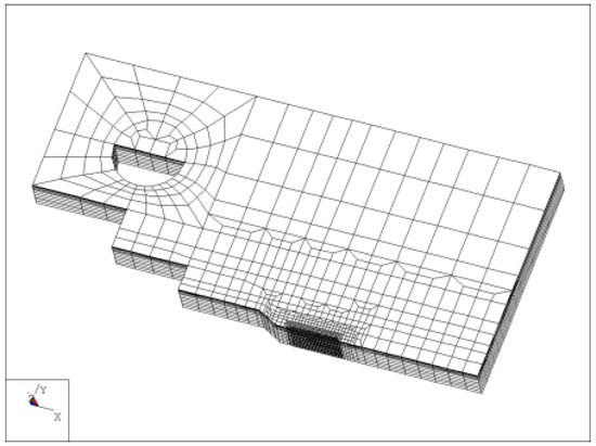 Due to its symmetry, only half of the specimen was modelled. The model was formed from 9185 isoparametric elements without central nodal points. The number of nodal points reached 10,968. The loading was applied through deformation by imposing a specific displacement of the central point of the pinhole. The equivalent force in the pinhole was determined as the sum of the reactions in the direction of the y-axis in all nodal points where displacements were imposed.