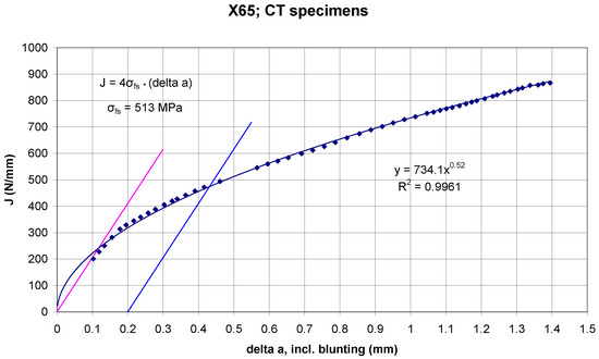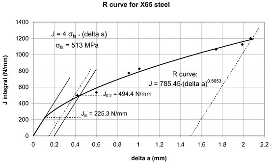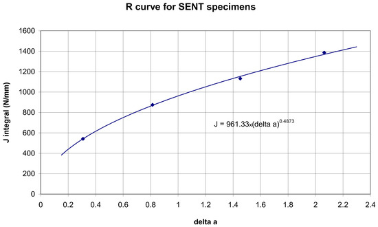 The transformation of the R-curves was carried out in such a way that the graphical curves in Figure 8 were digitalized and then the magnitudes of the crack extensions were increased by a blunting amount, i.e., J/4σfs. The flow stress σfs considered was the same as that determined experimentally in this work, i.e., σfs = 513 MPa. The points in the diagrams in Figure 9 and Figure 10 represent the digital readings of the curves in Figure 8, with the Δa values being increased by J/4σfs.