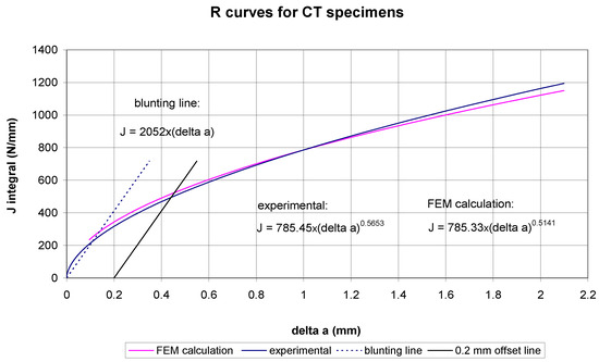The J-R curves for the CT specimens, obtained both experimentally and numerically, are compared in Figure 5. The power functions describing the R-curves are also given.