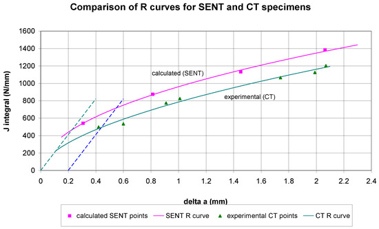 Besides the R-curve for the SENT specimens, determined by the regression of the calculated points, the experimental R-curve for the CT specimens is also represented, as well as the blunting line and the 0.2 mm offset line. The intersections of the SENT R-curve with the blunting line and the 0.2 mm offset line provide the initiation value of the J integral—Jin—and the J0.2 value at which the real (physical) crack extension is 0.2 mm. The appropriate obtained values are: