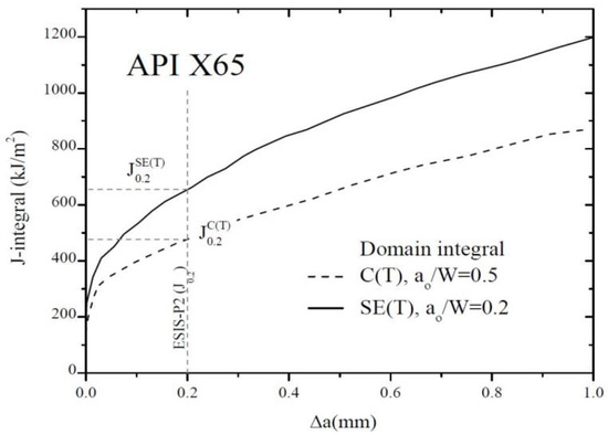 The material considered was pipeline steel X65, as was the steel used in this paper. As for the geometry of the SENT and CT specimens considered in [18], the width and thickness were the same for both specimens (w = 25.4 mm; B = 12.7 mm), while the relative crack length a/w was 0.2 for the SENT specimens and 0.5 for the CT specimens. As already shown, the width and thickness of the SENT and CT specimens dealt with in this paper were w = 50 mm; B = 8.7 mm, and the relative crack length a/w was 0.3 for the SENT specimen and 0.503 for the CT specimen. The differences in dimensions between the specimens considered in [18] and the specimens considered in this paper cause a certain difference in the crack tip constraint, which can lead to some differences in the respective R-curves. However, the character of the R-curves in Figure 8 indicates that the R-curve for the SENT specimens in Figure 7 is very likely correct. In order to support this statement, we will utilize the curves in Figure 8 together with the experimentally determined R-curve for the CT specimens (Figure 4) to construct the R-curve for the SENT specimens by using the approach of non-dimensional T stress, as described by Zhou [19]. The principle of this approach consists of considering the constants C1 and C2 in Equation (11) to be functions of a constraint; for example, Q, T/σ, or A2.