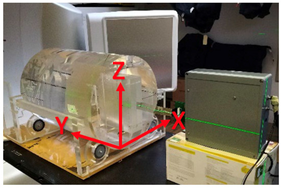 The experimental setup for the angular dependence study. The edgeless array is enclosed within a PMMA adaptor facing the beam direction (X-axis) at 0° (gantry angle is 90°). The incident beam is striking the array’s edge at 90° (Z-axis) when the beam is directed towards the floor.