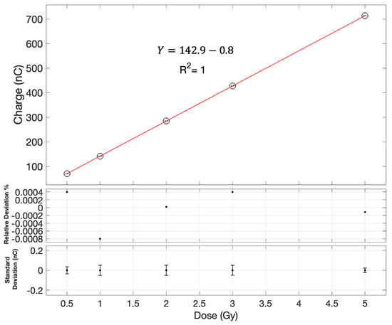 The charge collected by the central diode was plotted against the received dose and the sensitivity in Gy/nC was determined by employing a least-squares fitting method. The measurements were determined based on three repetitions to assess the detector response’s uncertainty.