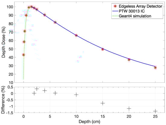 The measurements were normalized to the response at dmax (1.5 cm depth, reference conditions). The diode’s response for depths greater than dmax was compared to relative dosimetry measurements obtained using a PTW 30013 Farmer Ionization Chamber (IC) (PTW Freiburg GmbH, Freiburg, Germany). However, measurements at depths smaller than dmax were compared to GEANT4 simulations as Farmer ICs are not well suited for accurately measuring PDD at shallow depths.