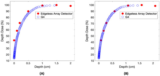 A comparison of the build-up region of the PDD relative to the reference GEANT4 calculation. The PDD dataset is examined both before (A) and after (B) the implementation of a 789 μm shift.