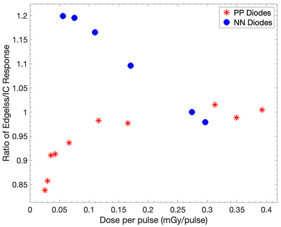 The ratio of the responses of the central edgeless diode and IC is investigated with respect to DPP. The ratios are normalized to a DPP of 0.27 mGy/pulse, corresponding to SSD of 100 cm. The output of PP diodes was obtained using the edgeless array compared to the response of NN diodes.