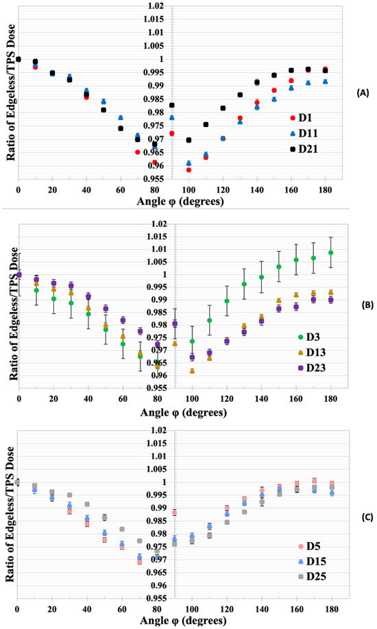 (A) The normalized dose ratios for edgeless diodes D1, D11, and D21 to the TPS-predicted dose at 0°. (B) The normalized dose ratios for diodes D3, D13, and D23. (C) The normalized dose ratios for diodes D5, D15, and D25. Error bars represent the standard deviation based on three measurements with the edgeless array.