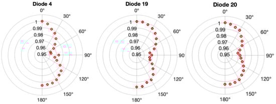 The variation in angle sensitivity for three diodes within the edgeless array. Polar plots illustrate the ratio of edgeless dose to TPS dose, normalized to the value at 0°, for diode 4, diode 19, and diode 20. Error bars, derived from three measurements using the edgeless array, are contained within the symbols.