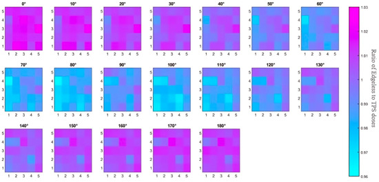 In summary, although a maximum variation of 4% is observed with some pixels for angles between 80° and 120°, the angular dependence of all diodes remained within 2% for irradiation angles below 80° and above 120°. The array’s angular dependence is visually represented in Figure 11 through a color map. Notably, the diode to TPS dose ratios in this case are not normalized to 0° but simply calculated as the ratio of the dose recorded by the sensor (calculated using the calibration factor described in Section 3.1) and the dose simulated by the TPS in the detector location. As the irradiation angle increases, the effects of attenuation from each silicon pixel become more evident, with dose ratios decreasing from approximately 1.02 to 0.97. The color map also highlights an increase in the ratios at 90° due to the residual airgap between the sensor array and the surrounding plastic phantom (estimated to be 100 microns). The small airgap between the diode and its encapsulation allows for higher penetration of the photons, which is not taken into account by the TPS. Additionally, Table 1 provides a comparison of the angular dependence of the edgeless array with currently available commercial 2D arrays.