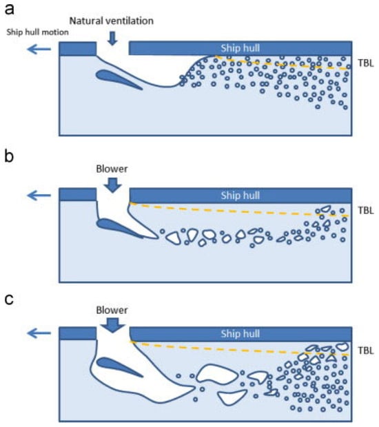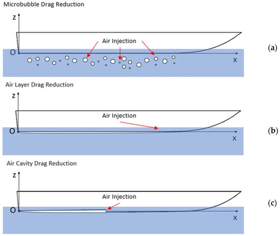 The different techniques for reducing drag through air lubrication can be classified as follows: (a) the microbubble drag reduction (MBDR) technique, (b) the air layer drag reduction (ALDR) technique, and (c) the air cavity drag reduction (ACDR) technique.