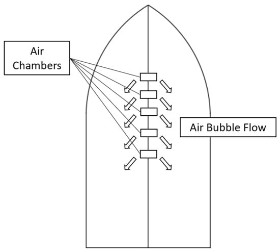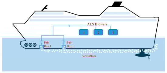 Diagram of the system of introducing the air layer under the hull bottom of the passenger vessel—air lubrication system (ALS) (Ref. [32] reproduced under a CC BY 4.0 DEED license).