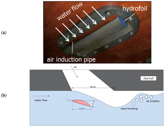 In the endeavour to diminish the hydrodynamic drag experienced by a ship’s hull at cruising speeds of 15–20 knots, the research spearheaded by Kumagai et al. [26] has culminated in the inception of a novel energy-conserving apparatus (Figure 2). This apparatus harnesses small bubbles, generated via the Kelvin–Helmholtz instability phenomenon. The device is ingeniously designed, comprising strategically angled hydrofoils equipped with air introducers, which are adeptly positioned beneath the air release vents on the hull’s surface. The primary objective of this advanced technology is to substantially mitigate the turbulent momentum transfer, fundamentally targeting the reduction of skin friction along the hull’s surface. This is achieved through the strategic injection of diminutive bubbles, each measuring less than 0.5 mm in diameter, directly into the turbulent boundary layer.