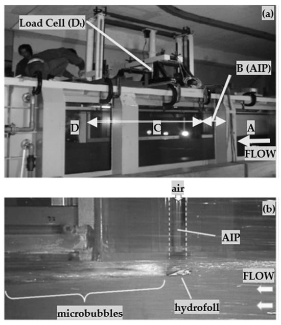 Recirculating water flow (shown in (a)) (West Japan Fluid Dynamics Engineering Laboratory Co. Ltd., Nagasaki, Japan); microscopic bubbles produced by the hydrofoil system (shown in (b)) (Ref. [26] reproduced under a CC BY-NC-ND 3.0 DEED license).