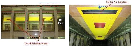 The experimental method of air layering was studied by authors Jinbo Jang et al. [3]. Experiments were conducted using a flat plate measuring 7.5 m × 1.0 m × 8 cm, horizontally mounted in the test section of a water tunnel (Figure 8). Air was injected through a flush slit near the front end of the plate, and two floating-plate-type friction sensors measured changes in local frictional drag caused by air layers. Additionally, six independent air injection units were installed on the ship model, flush with the hull’s bottom surface to avoid unwanted drag increase. Compressed air was stored in receivers on the ship model’s deck, and the air flow to the injection units was regulated by PC-controlled mass flow meters (Figure 9).