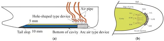 Fitting the ship model with two air injection apparatuses (a) and arrangement of air injection devices (b) (Ref. [34] reproduced under a CC BY license).