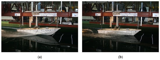 The tests examined the towing drag under conditions with and without air flow, thus enabling a comparison of the effectiveness of various air cavity configurations in the hull. Specifically, Figure 13 features two unpublished images from the experimental study conducted at the naval tank of the University of Naples Federico II by the authors Cucinotta et al. [41].