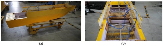 One of the most recent studies on ACS hulls was carried out by Song Lin et al. [42] in a towing tank 135 m long, 7 m wide, and 3.6 m deep. The model (Figure 14a), made from wood–plastic panels, was carefully constructed and equipped with a transparent plexiglass window (Figure 14b).