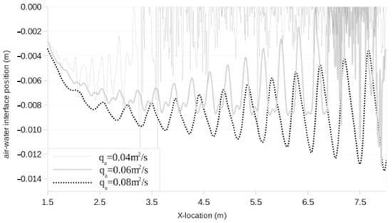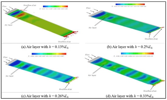 To further understand the impact of air flow rate and inflow velocity on air layer formation, the non-dimensional air flow rate coefficient (Equation (3)), Cq, is defined using the air flow rate (Q), inflow velocity (V), transverse width of the air injection entrance (B), and the thickness of the boundary layer at the air injection entrance without air injection (δ).