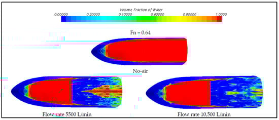 In Figure 5, the optimal functioning of the WAIP system is graphically depicted, showing variation with the ship’s draught. In conditions where the draught is shallow (less than 5 m), the hydrofoil functions as a self-priming pump, effectively releasing small air bubbles near the hull through the hydrofoil device (Figure 5a). For ships with deeper draughts (over 5 m), where the hydrofoil’s pressure reduction capacity is insufficient, a slight increase in air pressure is necessary to sustain microbubble formation (Figure 5b). In this configuration, the flow required is supplied by an air compressor, which is channelled through pipes along the hull of the ship and released above the hydrofoil in the area of low pressure. In the situation illustrated in Figure 5c, employing blowers that deliver high rates of air flow may result in a state where the hydrofoil becomes entirely separated from the adjacent water flow, resulting in the formation of only large bubbles beyond the boundary layer. This situation is not only inefficient for bubble generation but also increases the resistance caused by the hydrofoil, making the system less effective and wasting energy in bubble production.