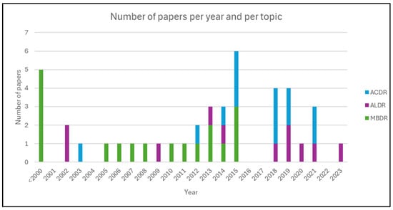 In Figure 22, the papers considered in this research are categorized by year and by topic, using the SCOPUS database as a reference. Before 2016, the major interest was in MBDR, then the number of papers related to ALDR and ACDR increased rapidly going towards 2023.