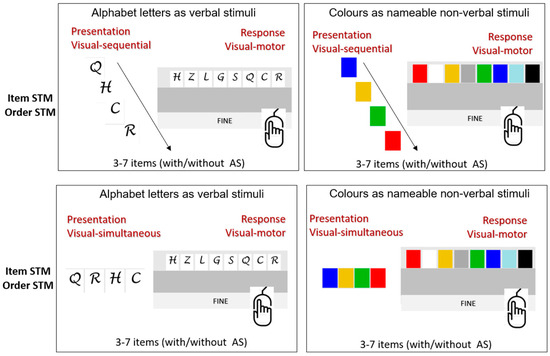 Several experiments investigated the involvement of STM in its variants depending on (i) different sensory input and output modalities (e.g., auditory–verbal, visual–verbal), (ii) the presence/absence of either articulatory suppression or distractors, (iii) the request to remember not only the items shown (STM for item, henceforth, MI) but also the order in which they were presented (STM for order, henceforth, MO) [18,19,20,21].