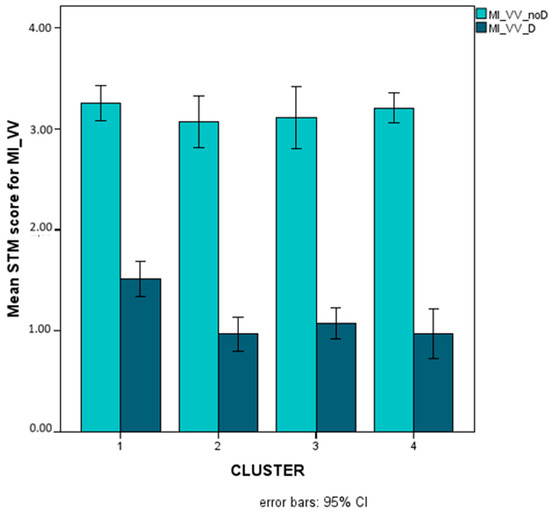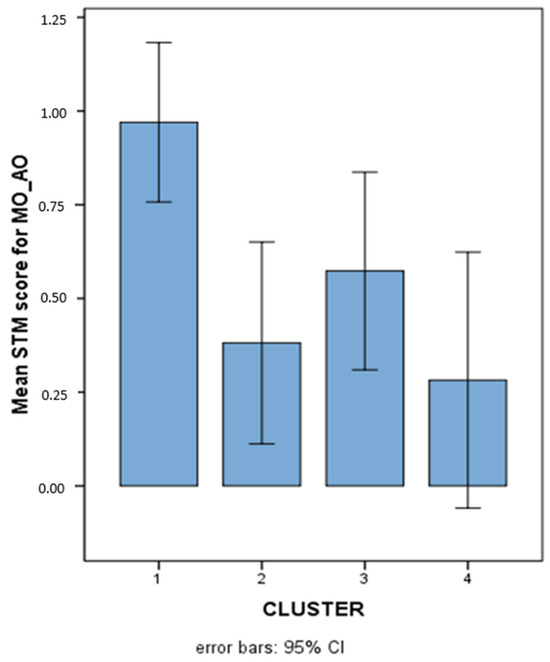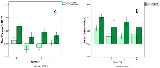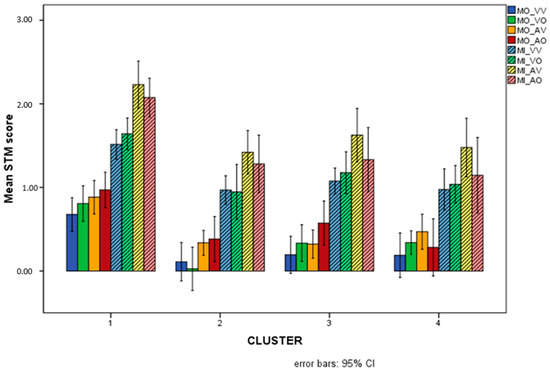 Subsequently, we took the STM variables, which had been pre-processed (through imputation of post-interruption lists and Logit transformation to normalize their distributions, see Appendix A for details), and averaged them in order to obtain eight overall STM variables (MO_VV, MI_VV, MO_AV, MI_AV, MO_VO, MI_VO, MO_AO, MI_AO). These eight variables resulted from the combination of type (item vs. order), input (visual—V vs. auditory—A) and output (oral—O vs. visual–motor—V), averaging further distinctions such as the type of stimulus (letters—Ls vs. colours—Cs) articulatory suppression (AS) (with vs. without), presentation (sequential—SEQ vs. simultaneous—SIM), and distractors—Ds (presence vs. absence). Then, the identified clusters were compared to the overall variables by means of a multivariate ANOVA with group as the between-subject factor and age as a covariate. Bonferroni correction was applied in this case, setting alpha at 0.05/8 = 0.006. For each of the overall variables that turned out to significantly differ among clusters, a repeated-measures analysis of variance (GLM) was conducted, setting all the variables that were distinctively assessed for the overall variable (e.g., sequential vs. simultaneous presentation, presence vs. absence of distractors, etc.) as within-subjects factors, and cluster as the between-subjects factor. Post hoc tests assessing differences between specific pairs of clusters were performed by applying Tukey’s correction. Finally, for each factor that turned out to significantly interact with the cluster variable, a further post hoc analysis was performed comparing the different levels of the variable that was significantly different among clusters. For this purpose, the other within-subject factors were averaged each time in a single compound variable (e.g., in order to compare sequential vs. simultaneous presentation for the MO_VV variable, letters and colours, as well as with/without AS, with/without distractors were averaged into two main variables expressing all instances of sequential and simultaneous presentation).