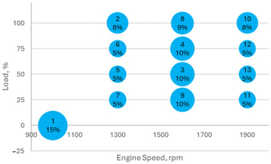 Exhaust emissions from internal combustion engines are dependent on engine operating states, both static and dynamic. Awareness of the dependence of the emission of toxic components from internal combustion engines on their operating states has led to the need to develop tests that correspond to actual engine operating conditions. This has led to the development of several static and dynamic tests typically used in approval procedures. The ESC (European Stationary Cycle) test is one of the more extensive static tests. ESC is a 13-phase, steady-state procedure, which has also been called the OICA or ACEA cycle [43]. Engine testing in the ESC test is a procedure that evaluates the emissions and fuel efficiency of engines. The test simulates urban driving conditions, where stopping and acceleration are common. During the test, the engine is run stationary and subjected to various load cycles that simulate typical city driving conditions [44]. The ESC test cycle was introduced along with the European Load Response (ELR) test and the European Transient Cycle (ETC) test as part of the Euro III emissions [45]. For this test, engine tests are conducted on an engine dynamometer at steady state. The engine must run for a specified time in each mode, reaching full speed and load changes within the first 20 s [46,47,48]. Circumferential torque must be maintained within ±2% of maximum torque, while the specified speed must be maintained within ±50 rpm. Emissions of toxic exhaust components are averaged over the cycle using weighting factors. Emissions results are expressed in g/kWh. Table 4 shows the test modes of the ESC test.