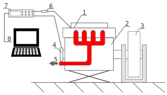 Test stand 1—pressure sensor, 2—Perkins CI engine, 3—Eddy current engine brake, 4—crankshaft position sensor, 5—exhaust gases, 6—signal amplifier, 7—AVL Indismart, and 8—computer for data acquisition.