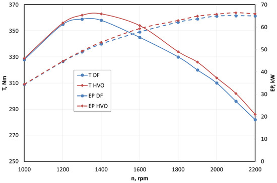 Speed characteristics. The waveforms of effective power (EP) and engine crankshaft torque (T) are a function of engine crankshaft speed when the engine is fed with diesel fuel (DF) and hydrogenated vegetable oil (HVO).