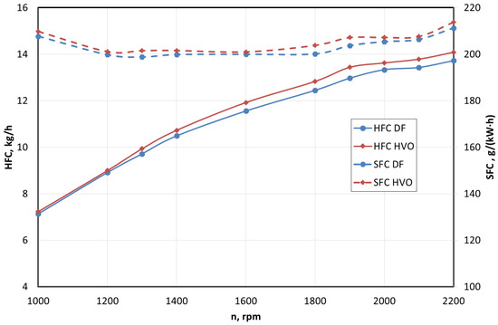 Speed characteristics. The waveforms of hourly fuel consumption (HFC) and specific fuel consumption (SFC) as a function of engine crankshaft speed for two fuels: diesel fuel (DF) and hydrogenated vegetable oil (HVO).