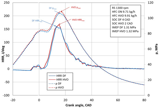 The waveforms of instantaneous pressure (p) and heat release rate (HRR) in the combustion chamber are a function of the crankshaft rotation angle. The measurement was performed at a maximum load and engine crankshaft speed of 1300 rpm.